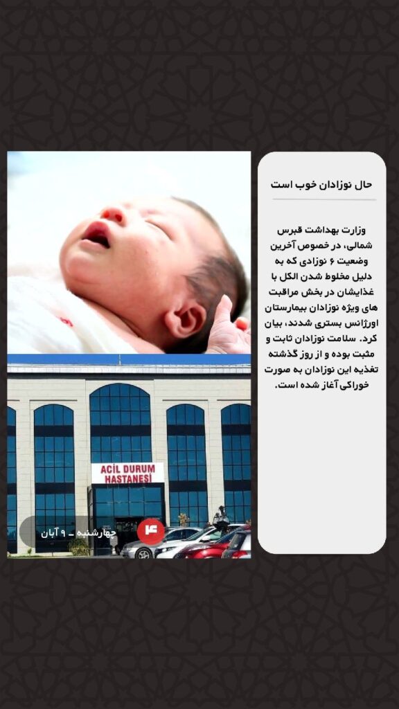 وزارت بهداشت قبرس شمالی، در خصوص آخرین وضعیت ۶ نوزادی که به دلیل مخلوط شدن الکل با غذایشان در بخش مراقبت های ویژه نوزادان بیمارستان اورژانس بستری شدند، بیان کرد. سلامت نوزادان ثابت و مثبت بوده و از روز گذشته تغذیه این نوزادان به صورت خوراکی آغاز شده است.
