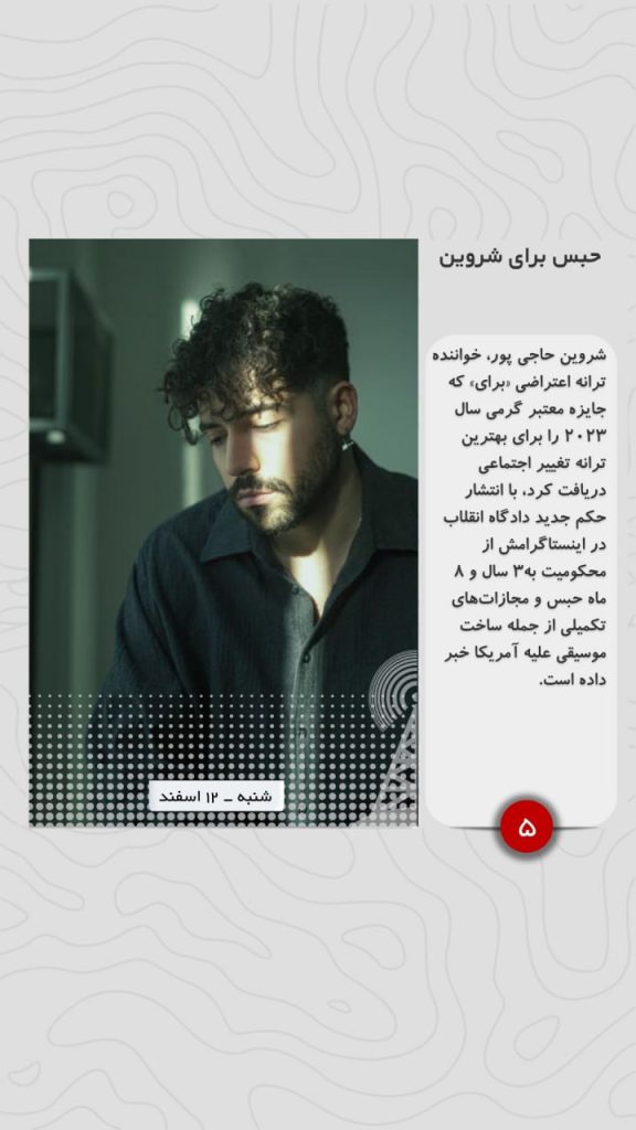 شروین حاجی پور، خواننده ترانه اعتراضی «برای» که جایزه معتبر گرمی سال ۲۰۲۳ را برای بهترین ترانه تغییر اجتماعی دریافت کرد، با انتشار حکم جدید دادگاه انقلاب در اینستاگرامش از محکومیت به۳ سال و ۸ ماه حبس و مجازاتهای تکمیلی از جمله ساخت موسیقی علیه آمریکا خبر داده است.