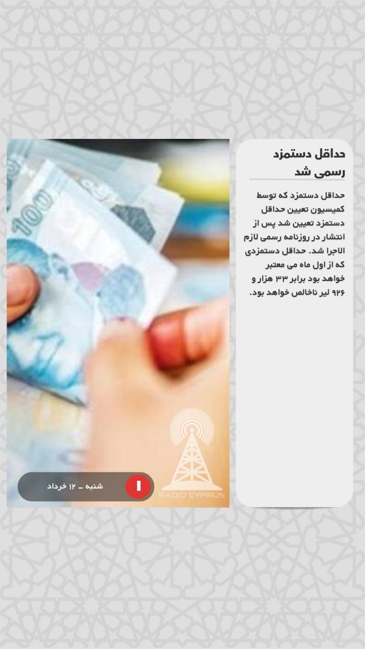 حداقل دستمزد که توسط کمیسیون تعیین حداقل دستمزد تعیین شد پس از انتشار در روزنامه رسمی لازم الاجرا شد. حداقل دستمزدی که از اول ماه می معتبر خواهد بود برابر ۳۳ هزار و ۹۲۶ لیر ناخالص خواهد بود.