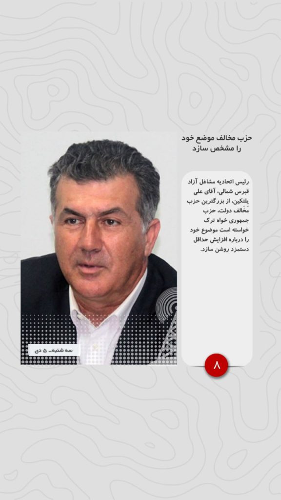 رئیس اتحادیه مشاغل آزاد قبرس شمالی، آقای علی یِلتِکین، از بزرگترین حزب مخالف دولت، حزب جمهوری خواه ترک خواسته است موضوع خود را درباره افزایش حداقل دستمزد روشن سازد.