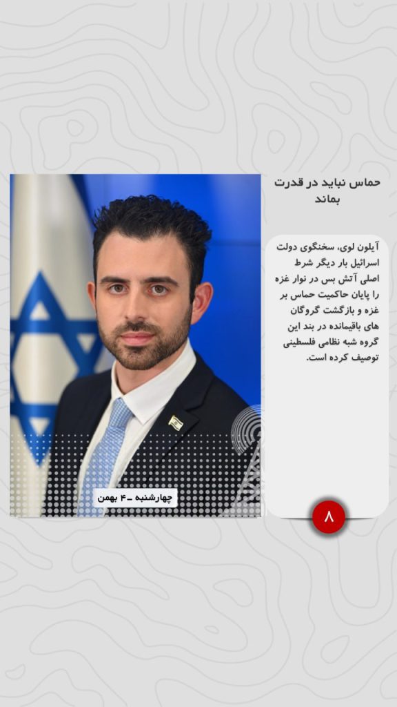 آیلون لوی، سخنگوی دولت اسرائیل بار دیگر شرط اصلی آتش بس در نوار غزه را پایان حاکمیت حماس بر غزه و بازگشت گروگان های باقیمانده در بند این گروه شبه نظامی فلسطینی توصیف کرده است.