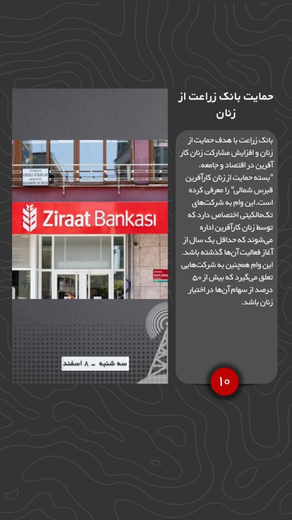 بانک زراعت با هدف حمایت از زنان و افزایش مشارکت زنان کار آفرین در اقتصاد و جامعه، “بسته حمایت از زنان کارآفرین قبرس شمالی” را معرفی کرده است.این وام به شرکتهای تکمالکیتی اختصاص دارد که توسط زنان کارآفرین اداره میشوند که حداقل یک سال از آغاز فعالیت آنها گذشته باشد. این وام همچنین به شرکتهایی تعلق میگیرد که بیش از ۵۰ درصد از سهام آنها در اختیار زنان باشد.