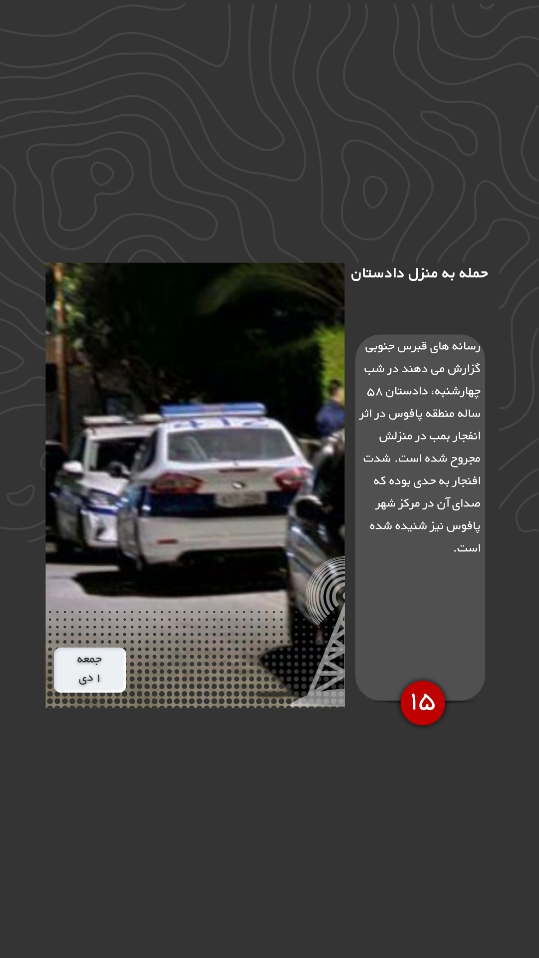 رسانه های قبرس جنوبی گزارش می دهند در شب چهارشنبه، دادستان ۵۸ ساله منطقه پافوس در اثر انفجار بمب در منزلش مجروح شده است. شدت افنجار به حدی بوده که صدای آن در مرکز شهر پافوس نیز شنیده شده است.