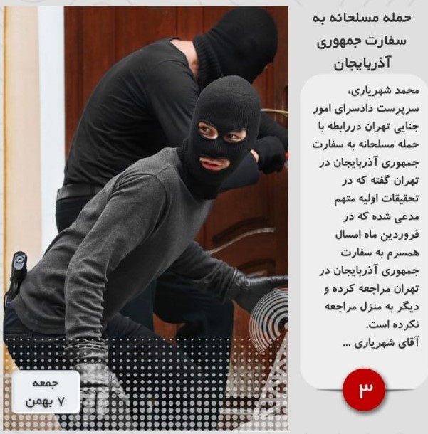 محمد شهریاری، سرپرست دادسرای امور جنایی تهران دررابطه با حمله مسلحانه به سفارت جمهوری آذربایجان در تهران گفته که در تحقیقات اولیه متهم مدعی شده که در فروردین ماه امسال همسرم به سفارت جمهوری آذربایجان در تهران مراجعه کرده و دیگر به منزل مراجعه نکرده است.