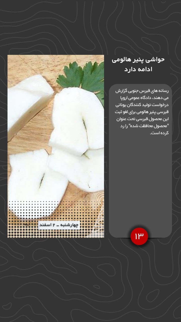 رسانه های قبرس جنوبی گزارش می دهند، دادگاه عمومی اروپا درخواست تولید کنندگان یونانی قبرسی پنیر هالومی برای لغو ثبت این محصول قبرسی تحت عنوان “محصول محافظت شده” را رد کرده است.