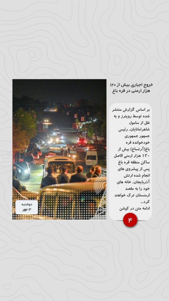 بر اساس گزارش منتشر شده توسط رویترز و به نقل از سامول شاهرامانایان, رئیس جمهور جمهوری خودخوانده قره باغ(آرتساخ) بیش از ۱۲۰ هزار ارمنی الاصل ساکن منطقه قره باغ پس از پیشروی های انجام شده ارتش آذربایجان, خانه های خود را به مقصد ارمنستان ترک خواهند کرد. رهبر جمهوری خود خوانده قره باغ به رویترز گفته است خروج اجباری ارمنی ها به دلیل ترس از آزار و اذیت نیروهای آذری بوده و نمی خواهند تحت حاکمیت آذربایجان در این منطقه زندگی کنند.