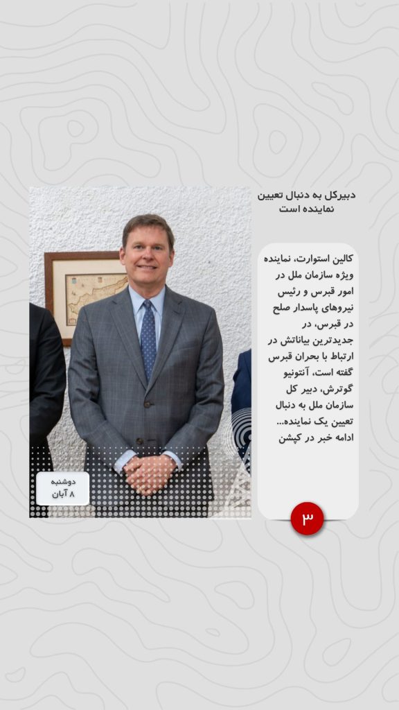 کالین استوارت، نماینده ویژه سازمان ملل در امور قبرس و رئیس نیروهای پاسدار صلح در قبرس، در جدیدترین بیاناتش در ارتباط با بحران قبرس گفته است، آنتونیو گوترش، دبیر کل سازمان ملل به دنبال تعیین یک نماینده ویژه در ارتباط با بحران قبرس است تا هرچه زودتر قفل مذاکرات شکسته شود.همچنین آقای استوارت گفته است، آنچه ما نیاز داریم، اراده سیاسی قوی، شجاعت و رهبری است که مایل به گرفتن تصمیمات سخت و دشوار باشد.