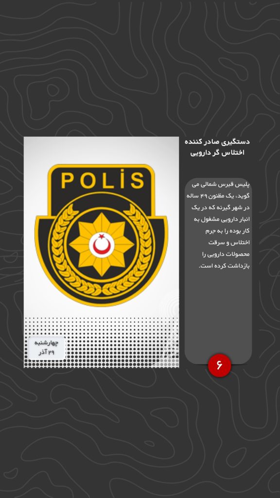 پلیس قبرس شمالی می گوید، یک مظنون ۴۹ ساله در شهر گیرنه که در یک انبار دارویی مشغول به کار بوده را به جرم اختلاس و سرقت محصولات دارویی را بازداشت کرده است.