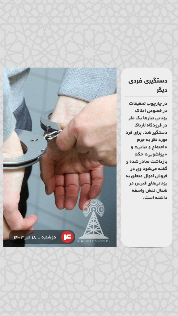در چارچوب تحقیقات در خصوص املاک یونانی تبارها یک نفر در فرودگاه لارناکا دستگیر شد. برای فرد مورد نظر به جرم «اجتماع و تبانی» و «پولشویی» حکم بازداشت صادر شده و گفته میشود وی در فروش اموال متعلق به یونانیهای قبرس در شمال نقش واسطه داشته است.