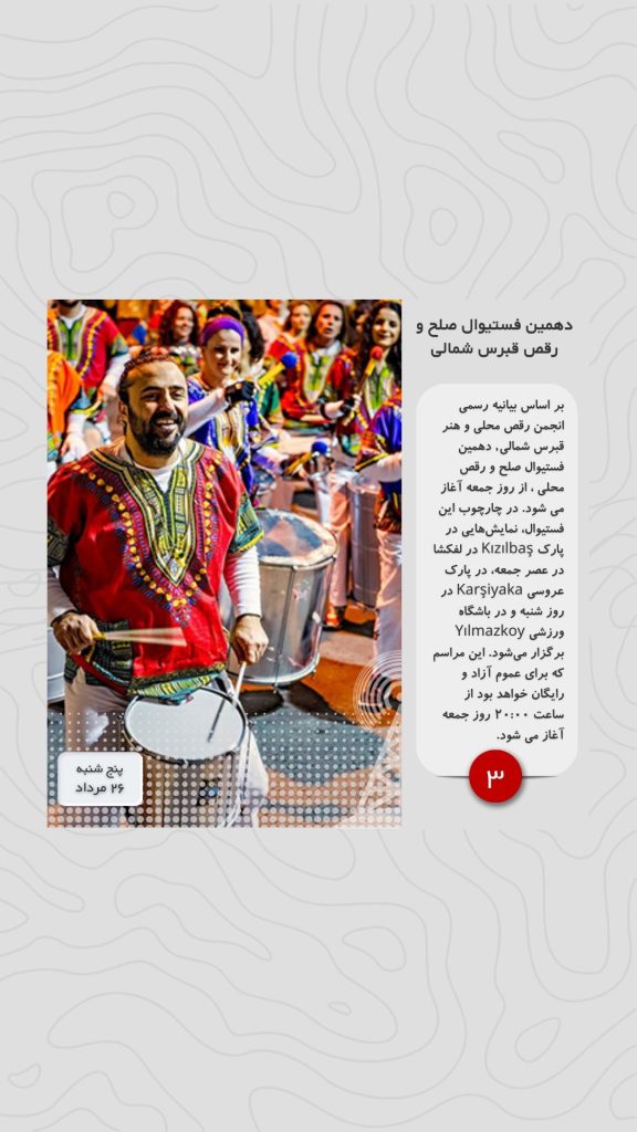 بر اساس بیانیه رسمی انجمن رقص محلی و هنر قبرس شمالی, دهمین فستیوال صلح و رقص محلی ، از روز جمعه آغاز می شود. در چارچوب این فستیوال، نمایشهایی در پارک Kızılbaş در لفکشا در عصر جمعه، در پارک عروسی Karşiyaka در روز شنبه و در باشگاه ورزشی Yılmazkoy برگزار میشود. این مراسم که برای عموم آزاد و رایگان خواهد بود از ساعت ۲۰:۰۰ روز جمعه آغاز می شود.