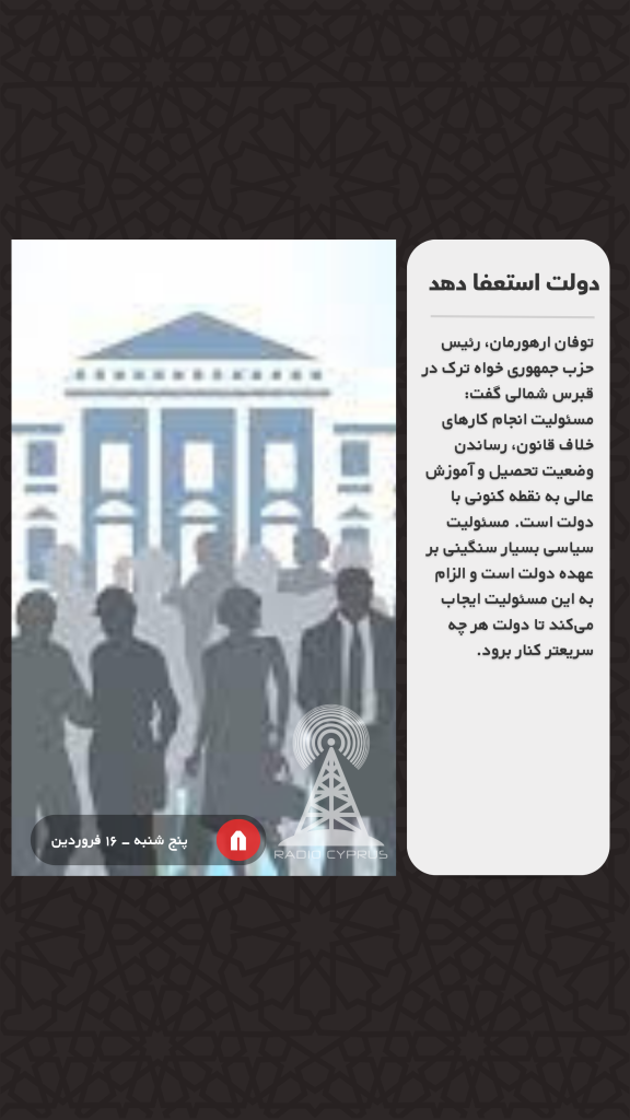 توفان ارهورمان، رئیس حزب جمهوری خواه ترک در قبرس شمالی گفت: مسئولیت انجام کارهای خلاف قانون، رساندن وضعیت تحصیل و آموزش عالی به نقطه کنونی با دولت است. مسئولیت سیاسی بسیار سنگینی بر عهده دولت است و الزام به این مسئولیت ایجاب می‌کند تا دولت هر چه سریعتر کنار برود.