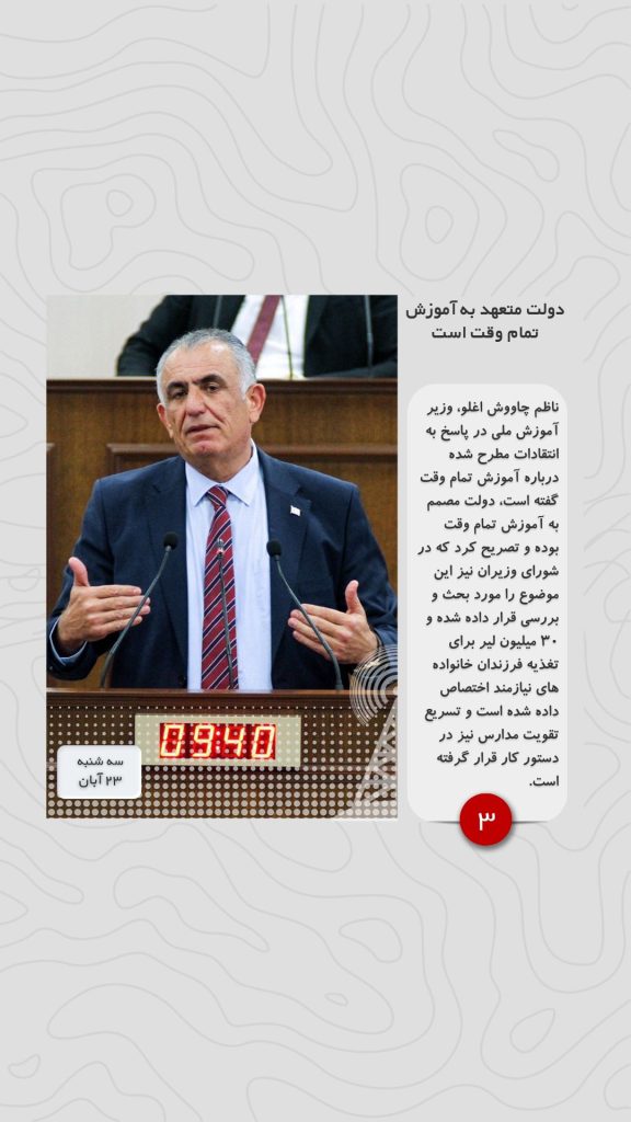 ناظم چاووش اغلو، وزیر آموزش ملی در پاسخ به انتقادات مطرح شده درباره آموزش تمام وقت گفته است، دولت مصمم به آموزش تمام وقت بوده و تصریح کرد که در شورای وزیران نیز این موضوع را مورد بحث و بررسی قرار داده شده و ۳۰ میلیون لیر برای تغذیه فرزندان خانواده های نیازمند اختصاص داده شده است و تسریع تقویت مدارس نیز در دستور کار قرار گرفته است.
