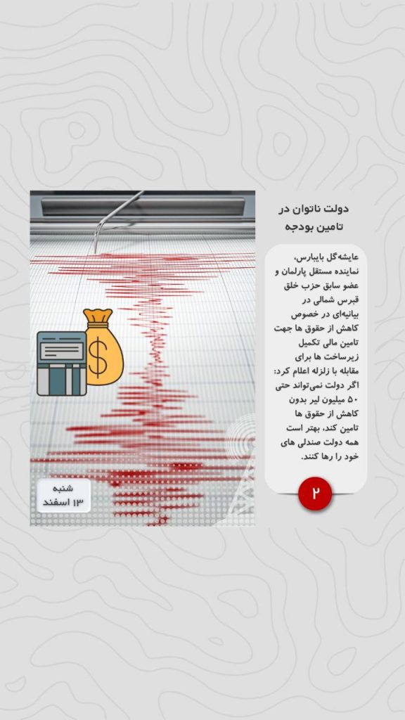 عایشه‌گل بایبارس، نماینده مستقل پارلمان و عضو سابق حزب خلق قبرس شمالی در بیانیه‌ای در خصوص کاهش از حقوق ها جهت تامین مالی تکمیل زیرساخت ها برای مقابله با زلزله اعلام کرد: اگر دولت نمی‌تواند حتی ۵۰ میلیون لیر بدون کاهش از حقوق ها تامین کند، بهتر است همه دولت صندلی های خود را رها کنند.
