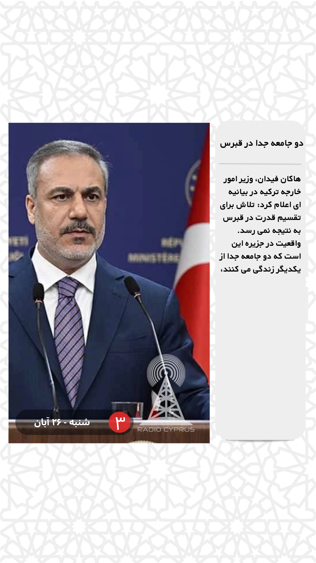 هاکان فیدان، وزیر امور خارجه ترکیه در بیانیه ای اعلام کرد: تلاش برای تقسیم قدرت در قبرس به نتیجه نمی رسد. واقعیت در جزیره این است که دو جامعه جدا از یکدیگر زندگی می کنند،