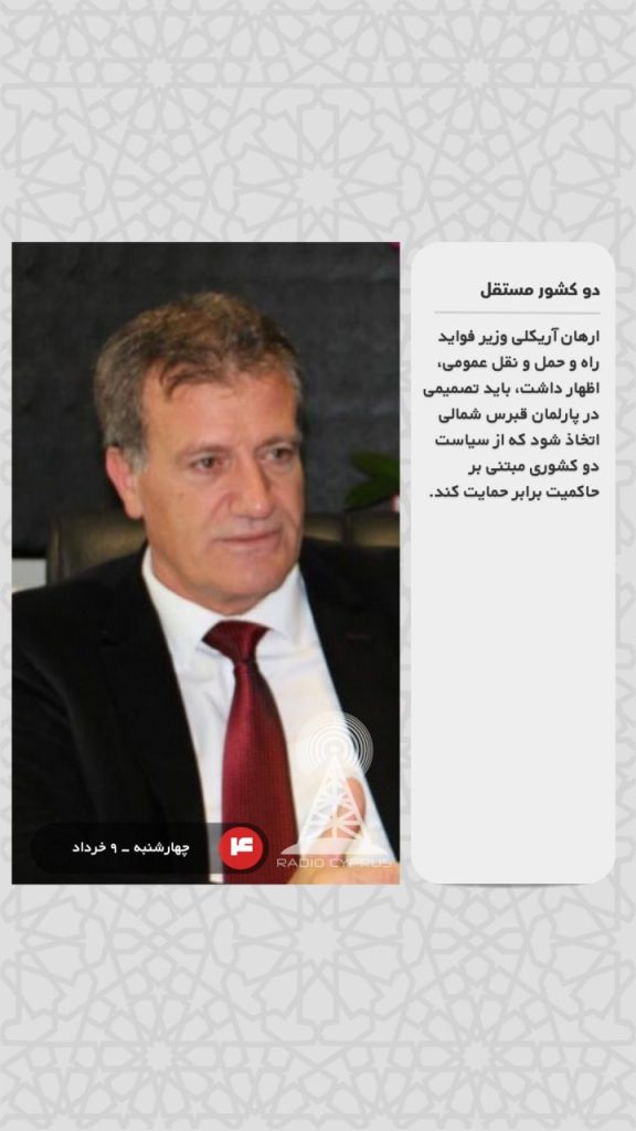 ارهان آریکلی وزیر فواید راه و حمل و نقل عمومی، اظهار داشت، باید تصمیمی در پارلمان قبرس شمالی اتخاذ شود که از سیاست دو کشوری مبتنی بر حاکمیت برابر حمایت کند.