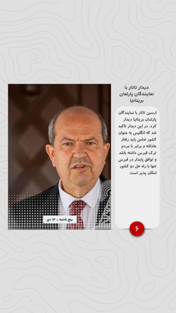ارسین تاتار با نمایندگان پارلمان بریتانیا دیدار کرد. در این دیدار تاکید شد که انگلیس به عنوان کشور ضامن باید رفتار عادلانه و برابر با مردم ترک قبرس داشته باشد و توافق پایدار در قبرس تنها با راه حل دو کشور امکان پذیر است.
