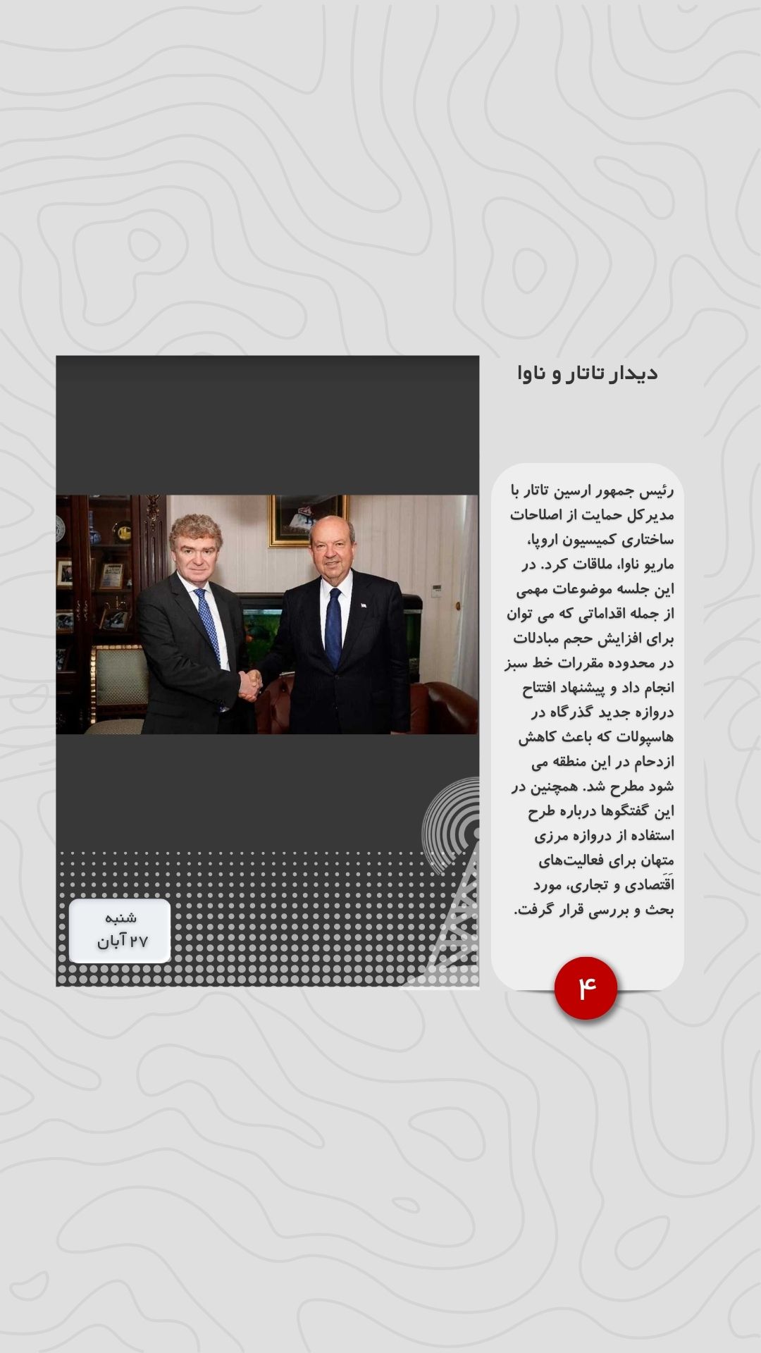 رئیس جمهور ارسین تاتار با مدیرکل حمایت از اصلاحات ساختاری کمیسیون اروپا، ماریو ناوا، ملاقات کرد. در این جلسه موضوعات مهمی از جمله اقداماتی که می توان برای افزایش حجم مبادلات در محدوده مقررات خط سبز انجام داد و پیشنهاد افتتاح دروازه جدید گذرگاه در هاسپولات که باعث کاهش ازدحام در این منطقه می شود مطرح شد. همچنین در این گفتگوها درباره طرح استفاده از دروازه مرزی مِتِهان برای فعالیت‌های اقتصادی و تجاری، مورد بحث و بررسی قرار گرفت.