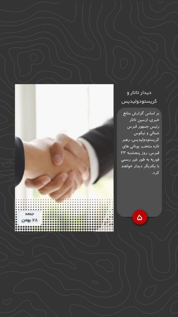 بر اساس گزارش منابع خبری، ارسین تاتار رئیس جمهور قبرس شمالی و نیکوس کریستودولیدیس، رهبر تازه منتخب یونانی های قبرس، روز پنجشنبه ۲۳ فوریه به طور غیر رسمی با یکدیگر دیدار خواهند کرد.