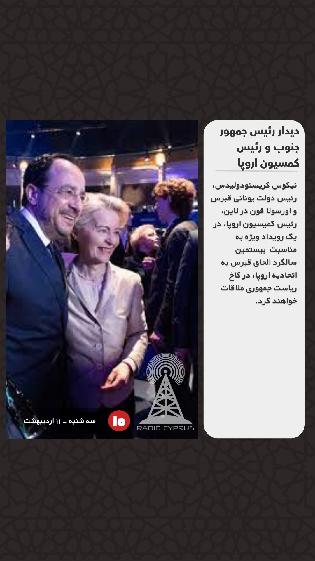 نیکوس کریستودولیدس، رئیس دولت یونانی قبرس و اورسولا فون در لاین، رئیس کمیسیون اروپا، در یک رویداد ویژه به مناسبت بیستمین سالگرد الحاق قبرس به اتحادیه اروپا، در کاخ ریاست جمهوری ملاقات خواهند کرد.