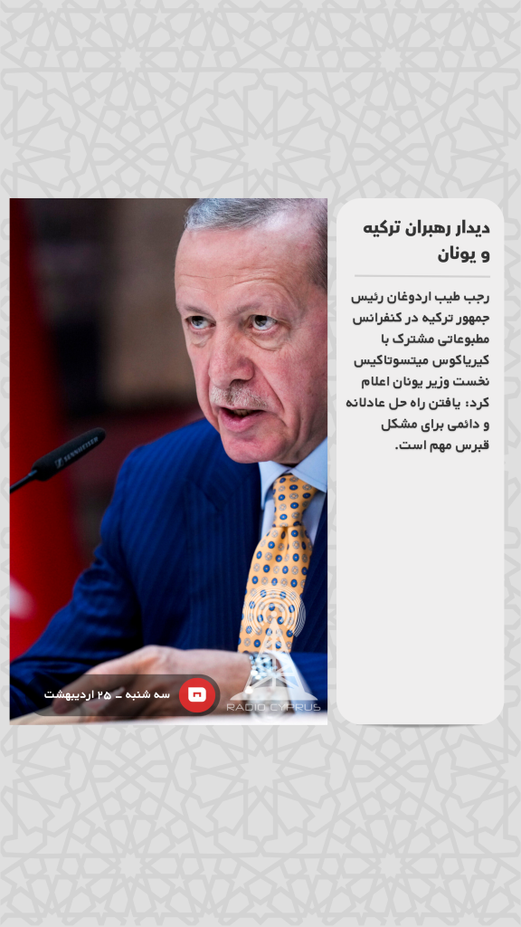 رجب طیب اردوغان رئیس جمهور ترکیه در کنفرانس مطبوعاتی مشترک با کیریاکوس میتسوتاکیس نخست وزیر یونان اعلام کرد: یافتن راه حل عادلانه و دائمی برای مشکل قبرس مهم است.