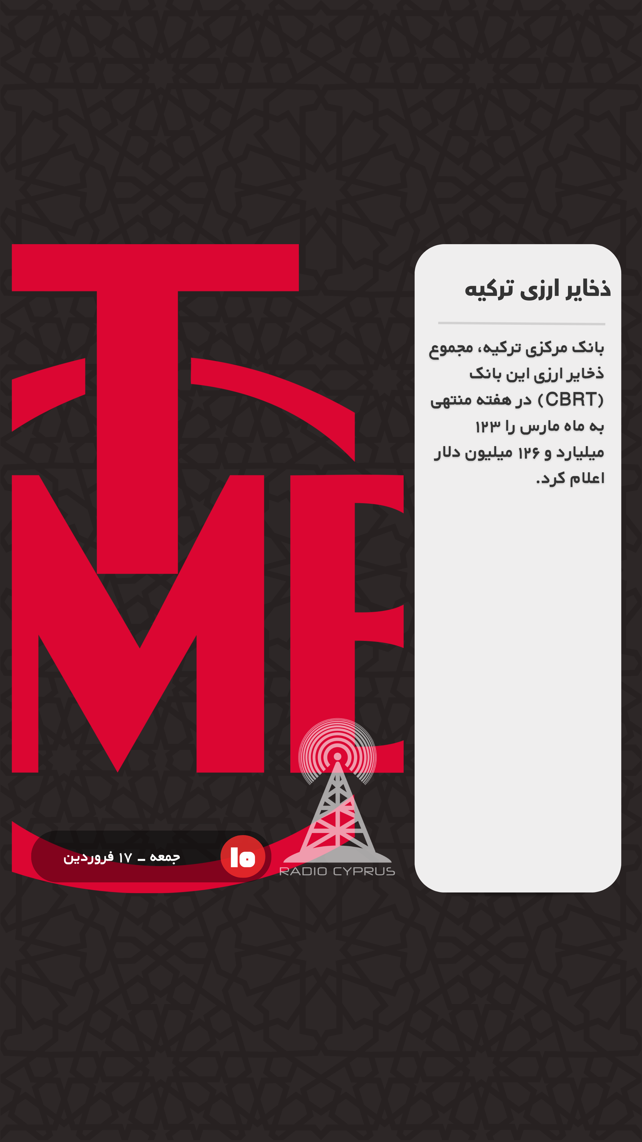 بانک مرکزی ترکیه، مجموع ذخایر ارزی این بانک (CBRT) در هفته منتهی به ماه مارس را ۱۲۳ میلیارد و ۱۲۶ میلیون دلار اعلام کرد.