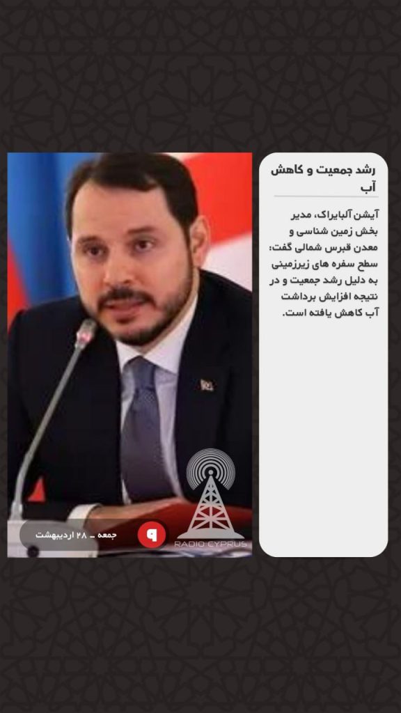 آیشن آلبایراک، مدیر بخش زمین شناسی و معدن قبرس شمالی گفت: سطح سفره های زیرزمینی به دلیل رشد جمعیت و در نتیجه افزایش برداشت آب کاهش یافته است.
