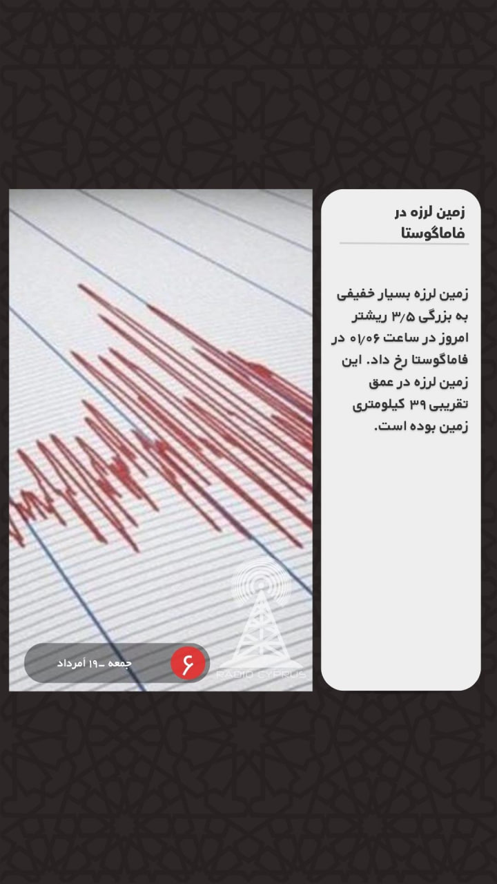 زمین لرزه بسیار خفیفی به بزرگی ۳.۵ ریشتر امروز در ساعت ۰۱.۰۶ در فاماگوستا رخ داد. این زمین لرزه در عمق تقریبی ۳۹ کیلومتری زمین بوده است.