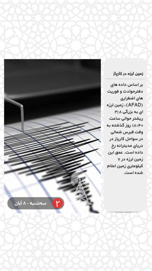 بر اساس داده های دفترحوادث و فوریت های اضطراری (AFAD)، زمین لرزه ای به بزرگی ۳.۸ ریشتر حوالی ساعت ۱۸:۴۰ روز گذشته به وقت قبرس شمالی در سواحل کارپاز در دریای مدیترانه رخ داده است. عمق این زمین لرزه در ۷ کیلومتری زمین اعلام شده است.