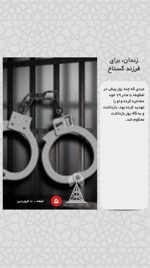 مردی که چند روز پیش در لفکوشا با مادر ۷۹ خود مشاجره کرده و او را تهدید کرده بود، بازداشت و به ۴۵ روز بازداشت محکوم شد.