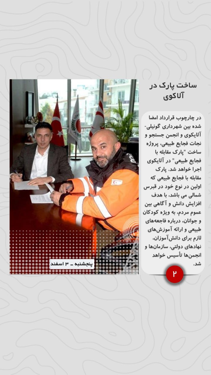 در چارچوب قرارداد امضا شده بین شهرداری گونیلی-آلایکوی و انجمن جستجو و نجات فجایع طبیعی، پروژه ساخت “پارک مقابله با فجایع طبیعی” در آلایکوی اجرا خواهد شد. پارک مقابله با فجایع طبیعی که اولین در نوع خود در قبرس شمالی می باشد، با هدف افزایش دانش و آگاهی بین عموم مردم، به ویژه کودکان و جوانان، درباره فاجعه‌های طبیعی و ارائه آموزش‌های لازم برای دانش‌آموزان، نهادهای دولتی، سازمان‌ها و انجمن‌ها تأسیس خواهد شد.