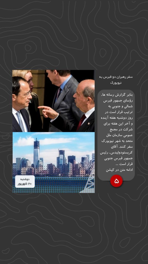 بنابر گزارش رسانه ها, رؤسای جمهور قبرس شمالی و جنوبی به ترتیب قرار است در روز دوشنبه هفته آینده و آخر این هفته برای شرکت در مجمع عمومی سازمان ملل متحد به شهر نیویورک سفر کنند. آقای کریستودولیدس, رئیس جمهور قبرس جنوبی قرار است رایزنی هایی با سازمان ملل متحد در ارتباط با انتخاب یک نماینده ویژه امور قبرس داشته باشد و همچنین با آنتونیو گوترش, دبیر کل سازمان ملل دیدار کند.
