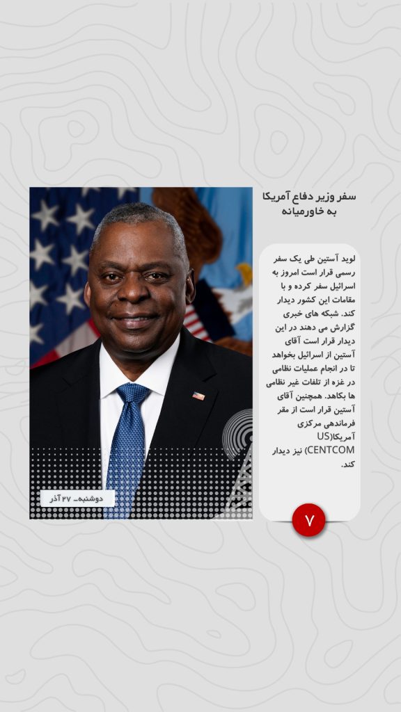 لوید آستین طی یک سفر رسمی قرار است امروز به اسرائیل سفر کرده و با مقامات این کشور دیدار کند. شبکه های خبری گزارش می دهند در این دیدار قرار است آقای آستین از اسرائیل بخواهد تا در انجام عملیات نظامی در غزه از تلفات غیر نظامی ها بکاهد. همچنین آقای آستین قرار است از مقر فرماندهی مرکزی آمریکا(US CENTCOM) نیز دیدار کند.