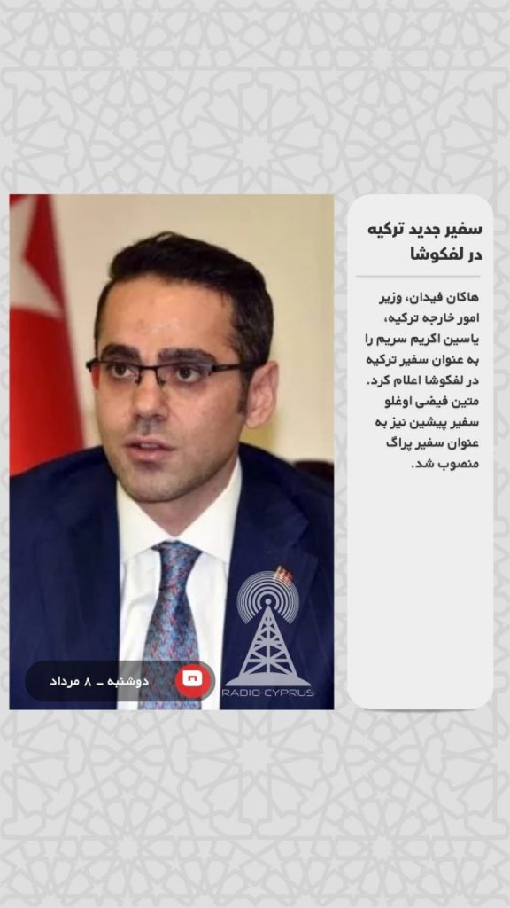 هاکان فیدان، وزیر امور خارجه ترکیه، یاسین اکریم سریم را به عنوان سفیر ترکیه در لفکوشا اعلام کرد. متین فیضی اوغلو سفیر پیشین نیز به عنوان سفیر پراگ منصوب شد.