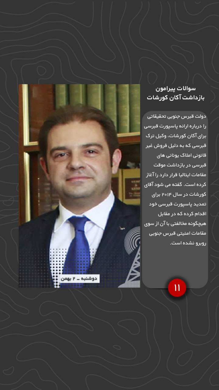 دولت قبرس جنوبی تحقیقاتی را درباره ارائه پاسپورت قبرسی برای آکان کورشات، وکیل ترک قبرسی که به دلیل فروش غیر قانونی املاک یونانی های قبرسی در بازداشت موقت مقامات ایتالیا قرار دارد را آغاز کرده است. گفته می شود آقای کورشات در سال ۲۰۱۴ برای تمدید پاسپورت قبرسی خود اقدام کرده که در مقابل هیچگونه مخالفتی با آن از سوی مقامات امنیتی قبرس جنوبی روبرو نشده است.