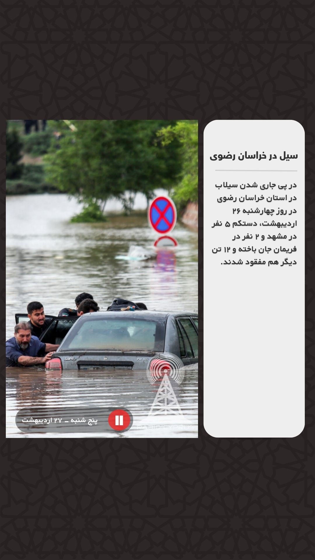 در پی جاری شدن سیلاب در استان خراسان رضوی در روز چهارشنبه ۲۶ اردیبهشت، دستکم ۵ نفر در مشهد و ۲ نفر در فریمان جان باخته و ۱۲ تن دیگر هم مفقود شدند.