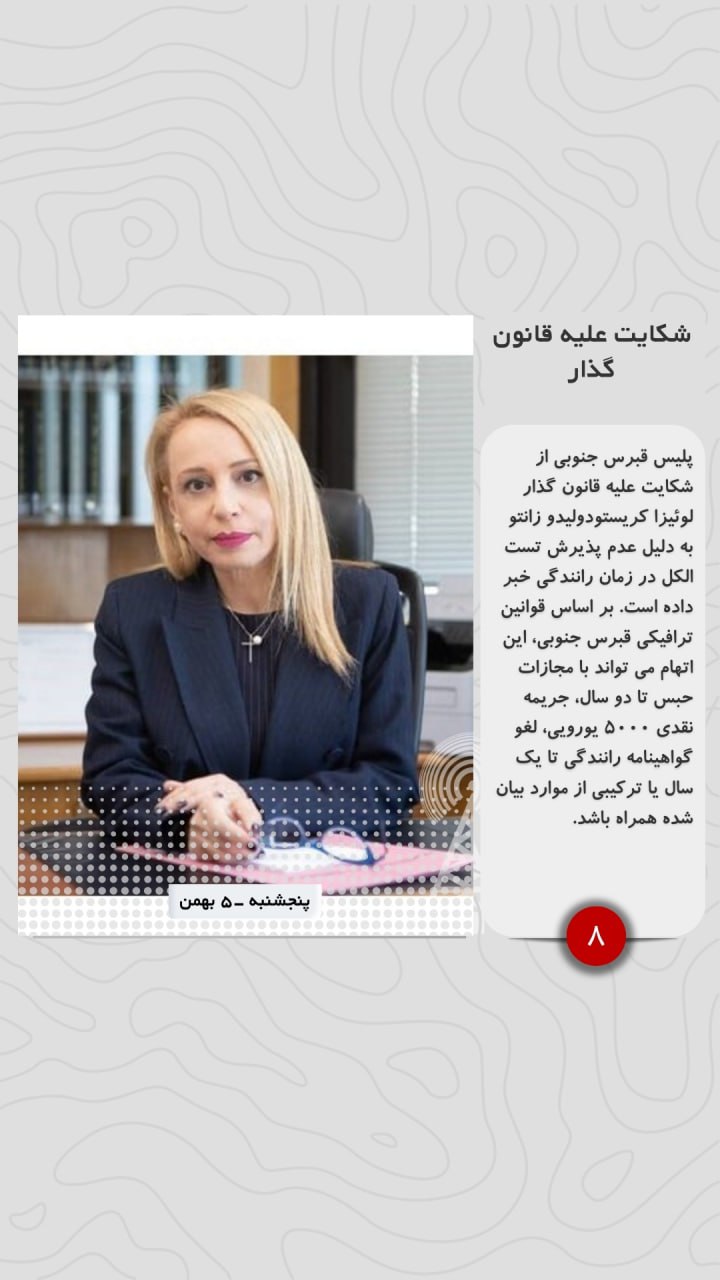 پلیس قبرس جنوبی از شکایت علیه قانون گذار لوئیزا کریستودولیدو زانتو به دلیل عدم پذیرش تست الکل در زمان رانندگی خبر داده است. بر اساس قوانین ترافیکی قبرس جنوبی، این اتهام می تواند با مجازات حبس تا دو سال، جریمه نقدی ۵۰۰۰ یورویی، لغو گواهینامه رانندگی تا یک سال یا ترکیبی از موارد بیان شده همراه باشد.