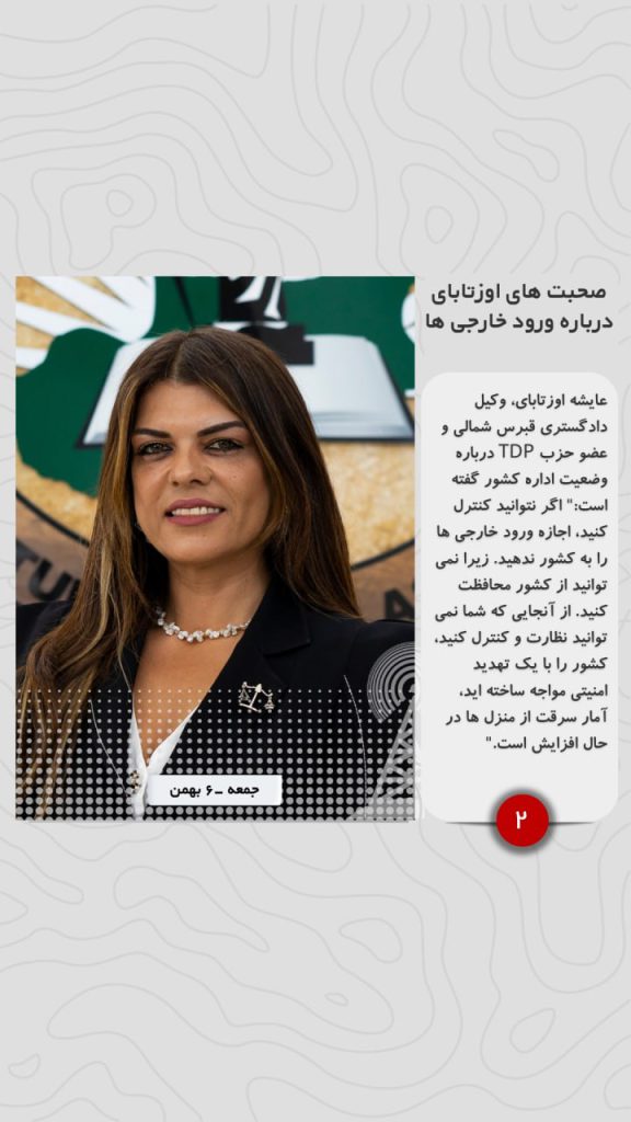 عایشه اوزتابای، وکیل دادگستری قبرس شمالی و عضو حزب TDP درباره وضعیت اداره کشور گفته است:” اگر نتوانید کنترل کنید، اجازه ورود خارجی ها را به کشور ندهید. زیرا نمی توانید از کشور محافظت کنید. از آنجایی که شما نمی توانید نظارت و کنترل کنید، کشور را با یک تهدید امنیتی مواجه ساخته اید، آمار سرقت از منزل ها در حال افزایش است.”