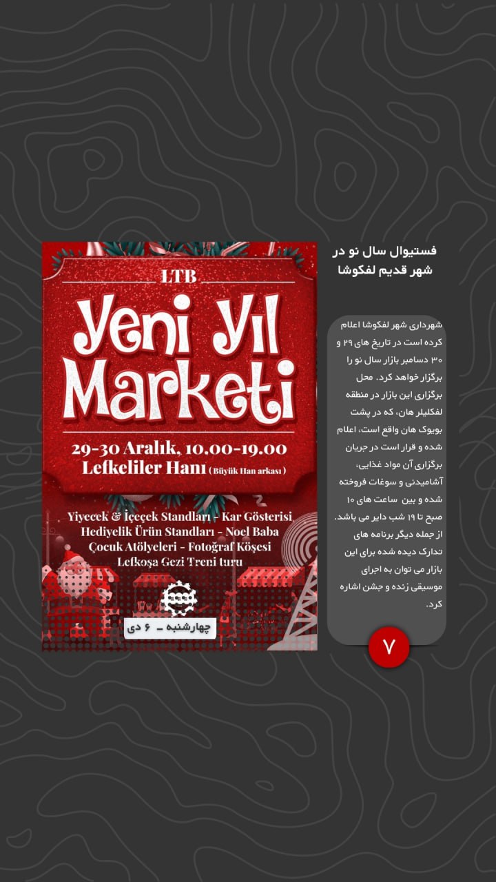 شهرداری شهر لفکوشا اعلام کرده است در تاریخ های ۲۹ و ۳۰ دسامبر بازار سال نو را برگزار خواهد کرد. محل برگزاری این بازار در منطقه لفکلیلر هان، که در پشت بویوک هان واقع است، اعلام شده و قرار است در جریان برگزاری آن مواد غذایی، آشامیدنی و سوغات فروخته شده و بین ساعت های ۱۰ صبح تا ۱۹ شب دایر می باشد. از جمله دیگر برنامه های تدارک دیده شده برای این بازار می توان به اجرای موسیقی زنده و جشن اشاره کرد.