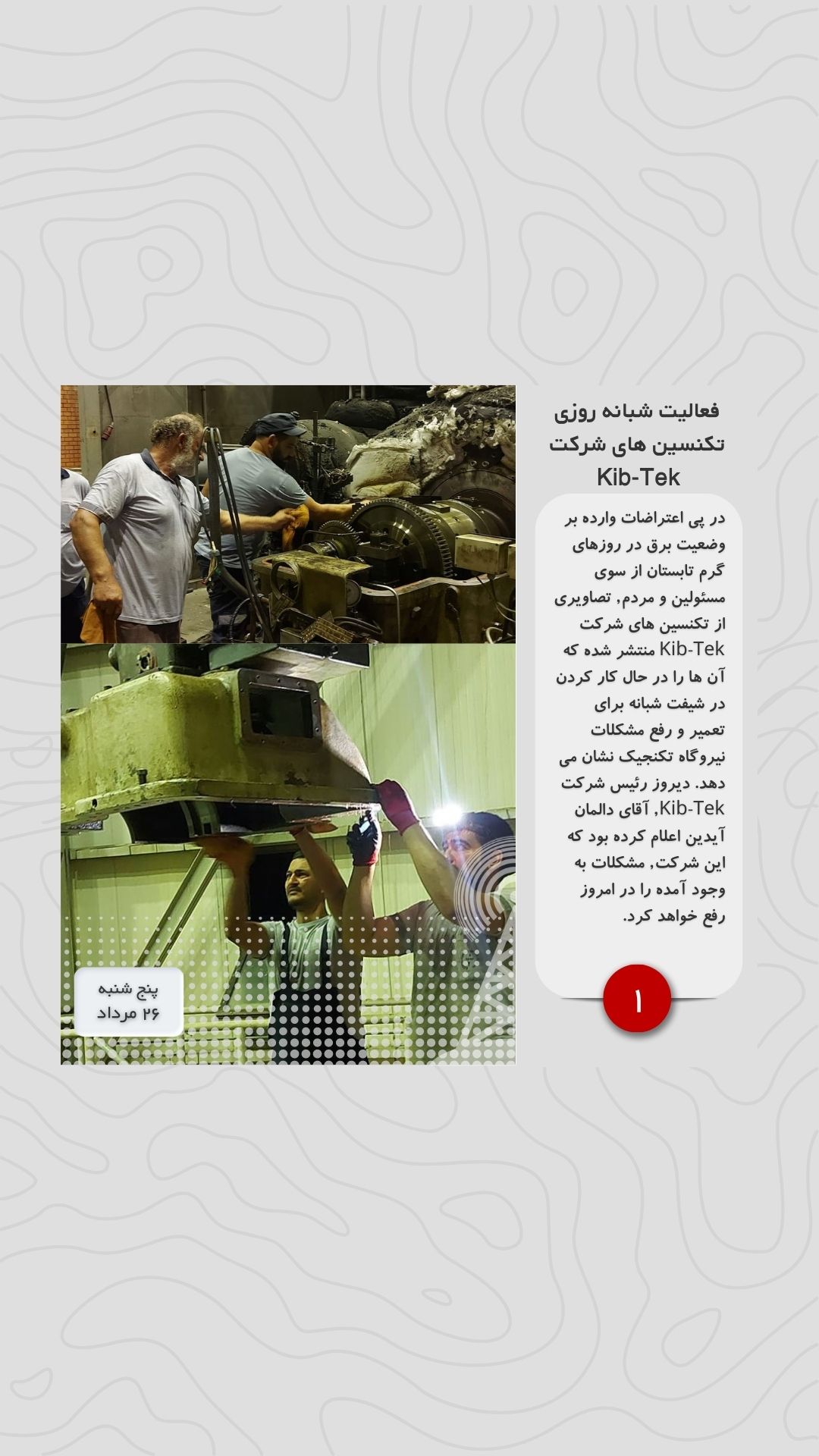 در پی اعتراضات وارده بر وضعیت برق در روزهای گرم تابستان از سوی مسئولین و مردم, تصاویری از تکنسین های شرکت Kib-Tek منتشر شده که آن ها را در حال کار کردن در شیفت شبانه برای تعمیر و رفع مشکلات نیروگاه تکنجیک نشان می دهد. دیروز رئیس شرکت Kib-Tek, آقای دالمان آیدین اعلام کرده بود که این شرکت, مشکلات به وجود آمده را در امروز رفع خواهد کرد.