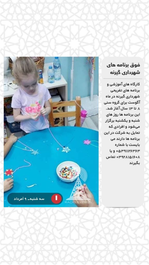 کارگاه های آموزشی و برنامه های تفریحی شهرداری گیرنه در ماه آگوست برای گروه سنی ۸ تا ۱۳ سال آغاز شد. این برنامه ها روز های شنبه و یکشنبه برگزار میشود و افرادی که تمایل به شرکت در این برنامه ها دارند می بایست با شماره ۰۵۳۹۱۱۲۶۳۶۳ و یا ۰۳۹۲۸۱۵۱۶۰۸ تماس بگیرند