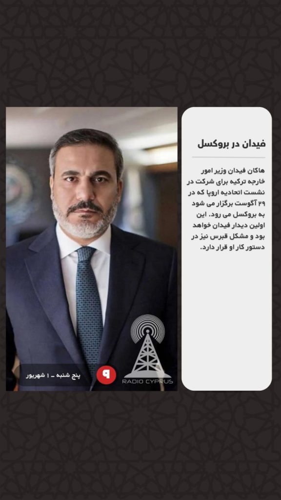 هاکان فیدان وزیر امور خارجه ترکیه برای شرکت در نشست اتحادیه اروپا که در ۲۹ آگوست برگزار می شود به بروکسل می رود. این اولین دیدار فیدان خواهد بود و مشکل قبرس نیز در دستور کار او قرار دارد.