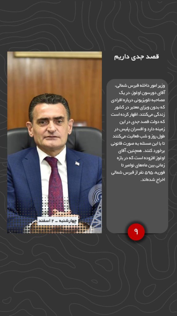 وزیر امور داخله قبرس شمالی، آقای دورسون اوغوز، در یک مصاحبه تلویزیونی درباره افرادی که بدون ویزای معتبر در کشور زندگی میکنند، اظهار کرده است که دولت قصد جدی در این زمینه دارد و افسران پلیس در طول روز و شب فعالیت میکنند تا با این مسئله به صورت قانونی برخورد کنند. همچنین، آقای اوغوز افزوده است که در بازه زمانی بین ماههای نوامبر تا فوریه، ۵۹۵ نفر از قبرس شمالی اخراج شدهاند.