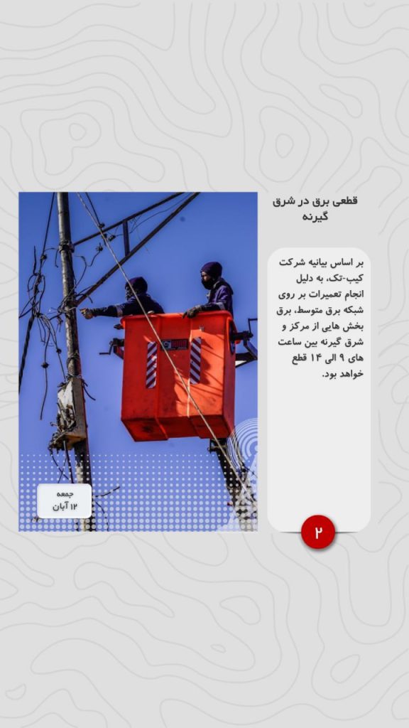 بر اساس بیانیه شرکت کیب-تک، به دلیل انجام تعمیرات بر روی شبکه برق متوسط، برق بخش هایی از مرکز و شرق گیرنه بین ساعت های ۹ الی ۱۴ قطع خواهد بود.