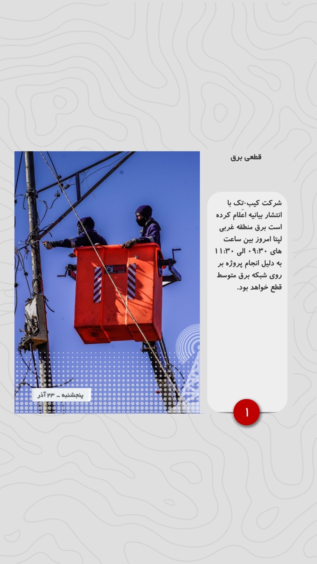 شرکت کیب-تِک با انتشار بیانیه اعلام کرده است برق منطقه غربی لپتا امروز بین ساعت های ۰۹:۳۰ الی ۱۱:۳۰ به دلیل انجام پروژه بر روی شبکه برق متوسط قطع خواهد بود.