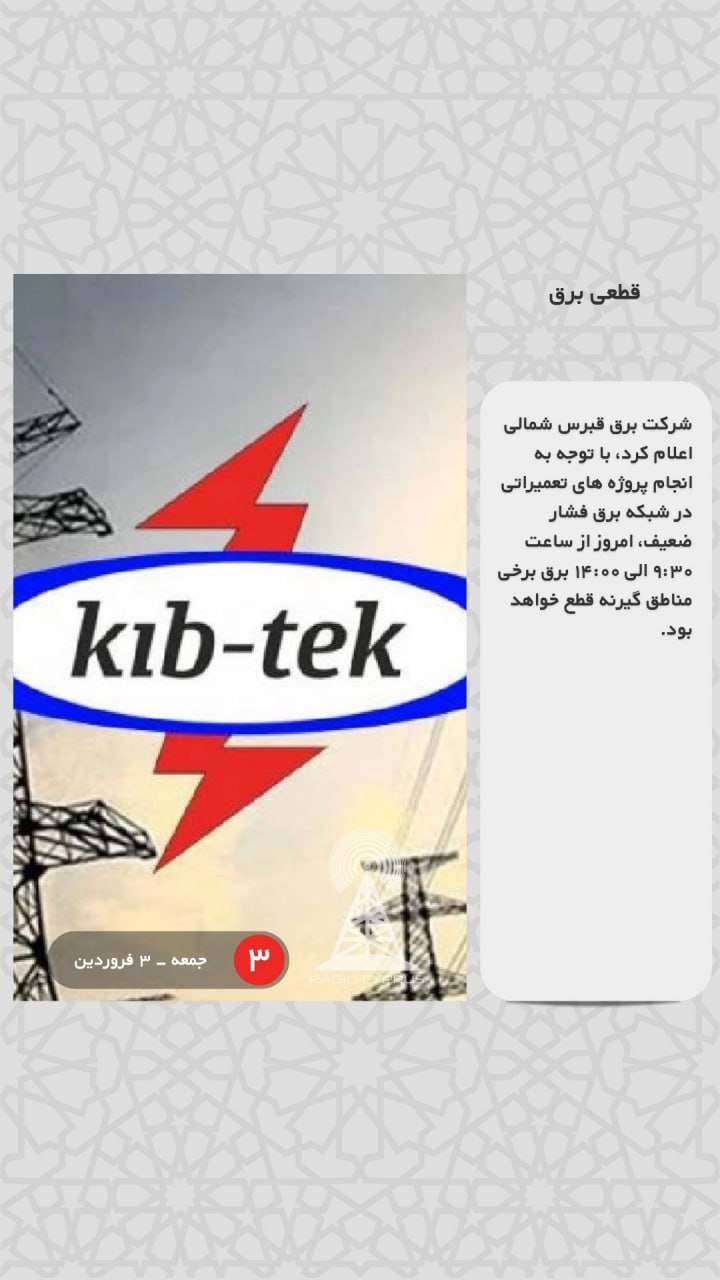 شرکت برق قبرس شمالی اعلام کرد، با توجه به انجام پروژه های تعمیراتی در شبکه برق فشار ضعیف، امروز از ساعت ۹:۳۰ الی ۱۴:۰۰ برق برخی مناطق گیرنه قطع خواهد بود.