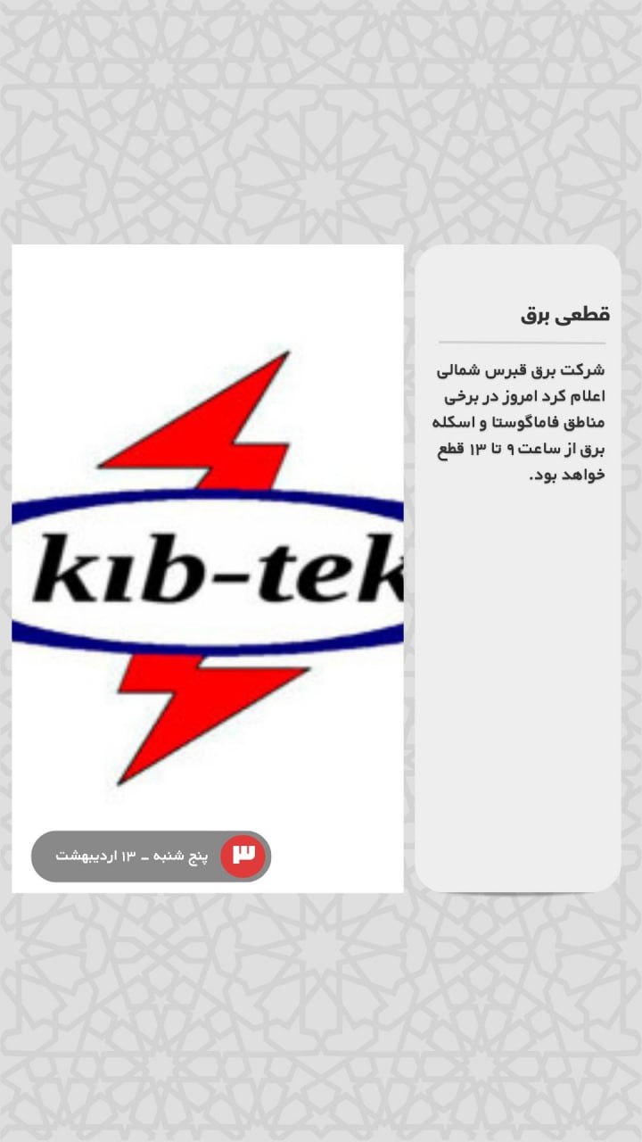 شرکت برق قبرس شمالی اعلام کرد امروز در برخی مناطق فاماگوستا و اسکله برق از ساعت ۹ تا ۱۳ قطع خواهد بود.