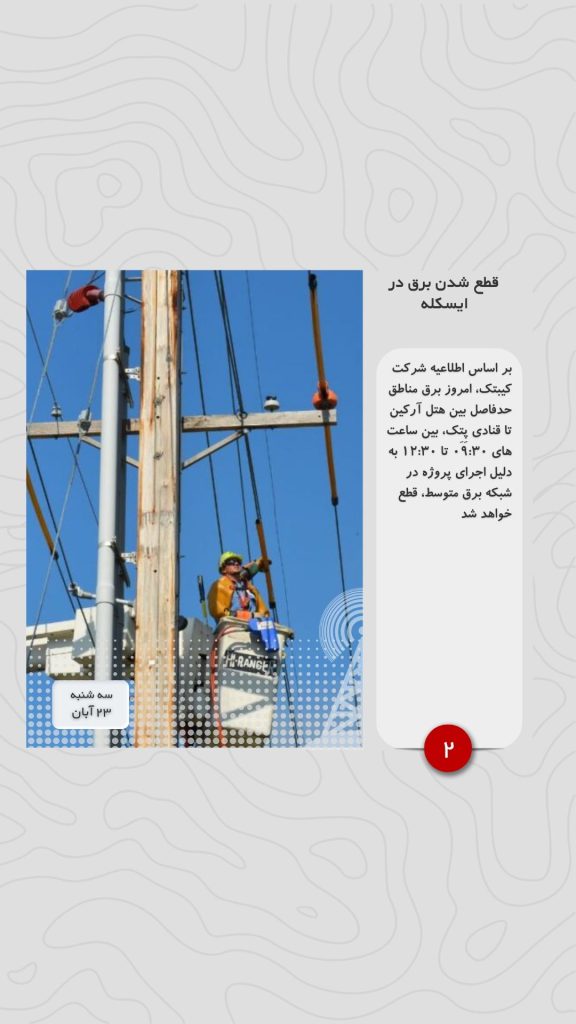 بر اساس اطلاعیه شرکت کیبتک، امروز برق مناطق حدفاصل بین هتل آرکین تا قنادی پِتِک، بین ساعت های ۰۹:۳۰ تا ۱۲:۳۰ به دلیل اجرای پروژه در شبکه برق متوسط، قطع خواهد شد.