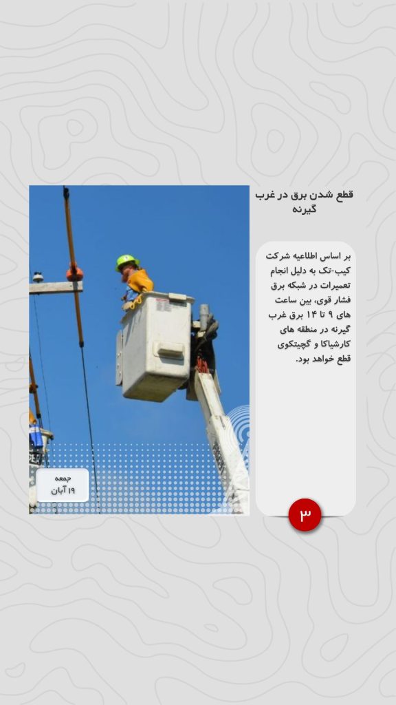 بر اساس اطلاعیه شرکت کیب-تک به دلیل انجام تعمیرات در شبکه برق فشار قوی، بین ساعت های ۹ تا ۱۴ برق غرب گیرنه در منطقه های کارشیاکا و گچیتکوی قطع خواهد بود.