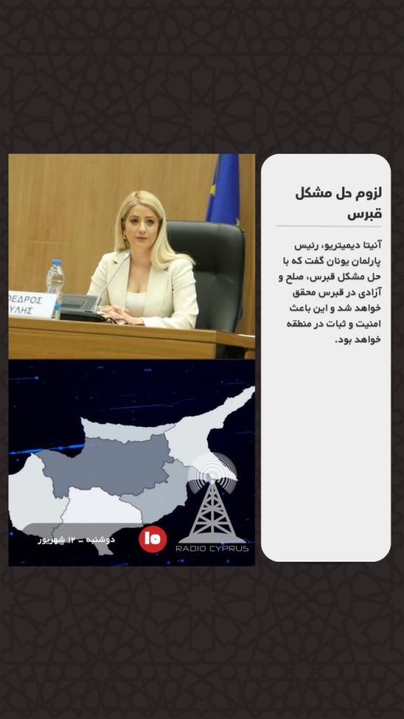 آنیتا دیمیتریو، رئیس پارلمان یونان گفت که با حل مشکل قبرس، صلح و آزادی در قبرس محقق خواهد شد و این باعث امنیت و ثبات در منطقه خواهد بود.