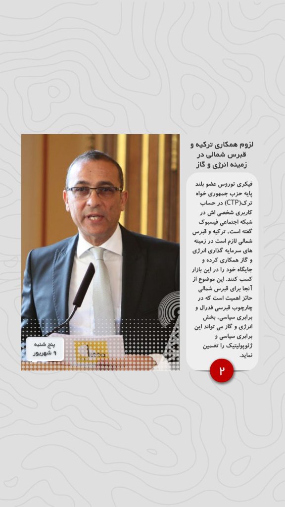 فیکری توروس عضو بلند پایه حزب جمهوری خواه ترک(CTP) در حساب کاربری شخصی اش در شبکه اجتماعی فیسبوک گفته است, ترکیه و قبرس شمالی لازم است در زمینه های سرمایه گذاری انرژی و گاز همکاری کرده و جایگاه خود را در این بازار کسب کنند. این موضوع از آنجا برای قبرس شمالی حائز اهمیت است که در چارچوب قبرسی فدرال و برابری سیاسی, بخش انرژی و گاز می تواند این برابری سیاسی و ژئوپولیتیک را تضمین نماید.